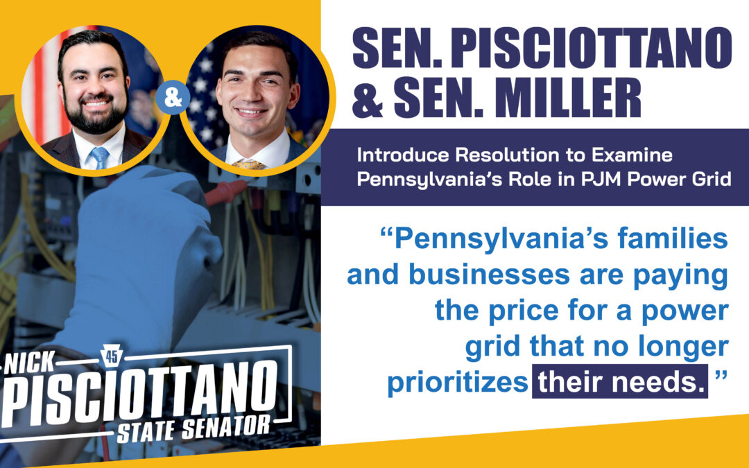 Harrisburg, PA, October 15, 2025 – State Senator Nick Pisciottano (D-Allegheny) and State Senator Nick Miller (D-Lehigh/Northampton) today announced plans to introduce a resolution directing the Joint State Government Commission (JSGC) to study Pennsylvania’s participation in the PJM Interconnection LLC, the regional transmission organization that manages the electric grid across much of the Mid-Atlantic and parts of the Midwest.